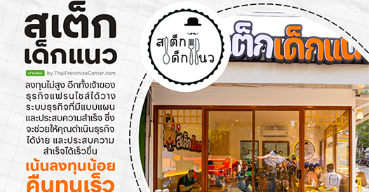| ใครกำลังว่างงาน ตกงาน อยากมีธุรกิจเป็นของตัวเอง หรือ อยากมีรายได้เพิ่มจากงานประจำที่ทำอยู่ ลองพิจารณาธุรกิจ สเต็กเด็กแนวแฟรนไชส์ดูครับ ลงทุนไม่สูง อีกทั้งเจ้าของธุรกิจแฟรนไชส์ได้วางระบบธุรกิจที่มีแบบแผน และประสบความสำเร็จมาให้กับคุณแล้ว ซึ่งจะช่วยให้คุณดำเนินธุรกิจได้ง่าย และประสบความสำเร็จได้เร็วขึ้น - เน้นลงทุนน้อย (เพียงหมื่นต้นๆ) เป็นค่าวัตถุดิบและอุปกรณ์ล้วนๆ