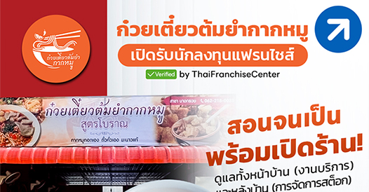 | | แฟรนไชส์ก๋วยเตี๋ยวต้มยำกากหมู เน้นความเป็นโบราณ ใส่ใจเรื่องการคัดสรรวัตุดิบ ชูกากหมูเจียวที่ไม่มีใครเหมือน มีสูตรการทำที่ชัดเจน มีระบบการสอนทั้งหน้าบ้านและหลังบ้าน เซ็นสัญญาครั้งเดียว ไม่มีรายเดือน รายปี | | | | | | | พ.ศ. 2563 (ก่อตั้งมา 6 ปี) |