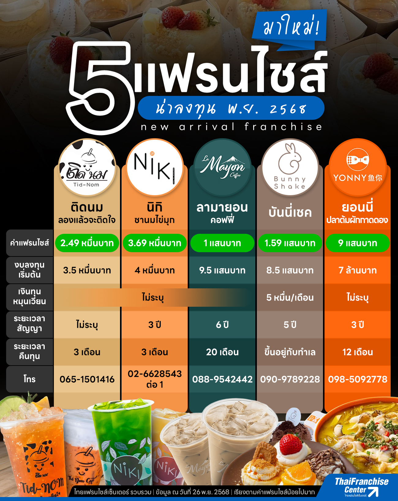 5 แฟรนไชส์มาใหม่! น่าลงทุนประจำเดือนพฤศจิกายน 2568