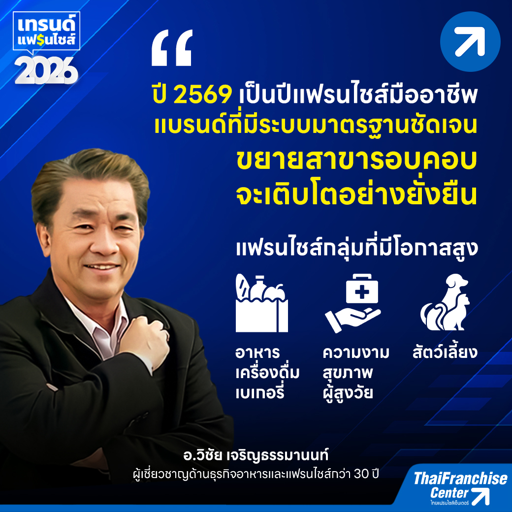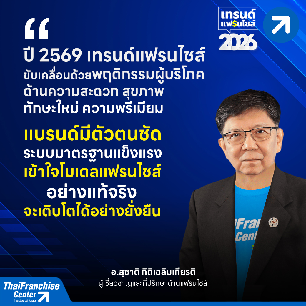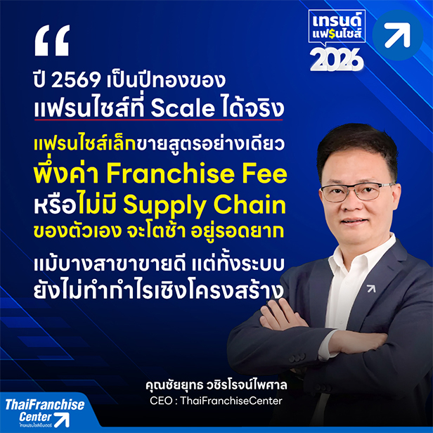 คุณชัยยุทธ วชิรโรจน์ไพศาล CEO ไทยแฟรนไชส์เซ็นเตอร์ มองว่า แนวโน้มแฟรนไชส์ปี 2569 แฟรนไชส์ขนาดเล็กจะค่อยๆ ลดจำนวนลง เนื่องจากปี 2569 จะเป็นปีที่เห็นภาพชัดเจนมากขึ้นว่า ธุรกิจแฟรนไชส์ขนาดเล็กจำนวนมากจะอยู่รอดยากขึ้น ไม่ใช่เพราะสินค้าไม่ดีแต่เป็นเพราะไม่สามารถ Scale ธุรกิจขึ้นไปสู่ระดับ Economy of Scale ได้