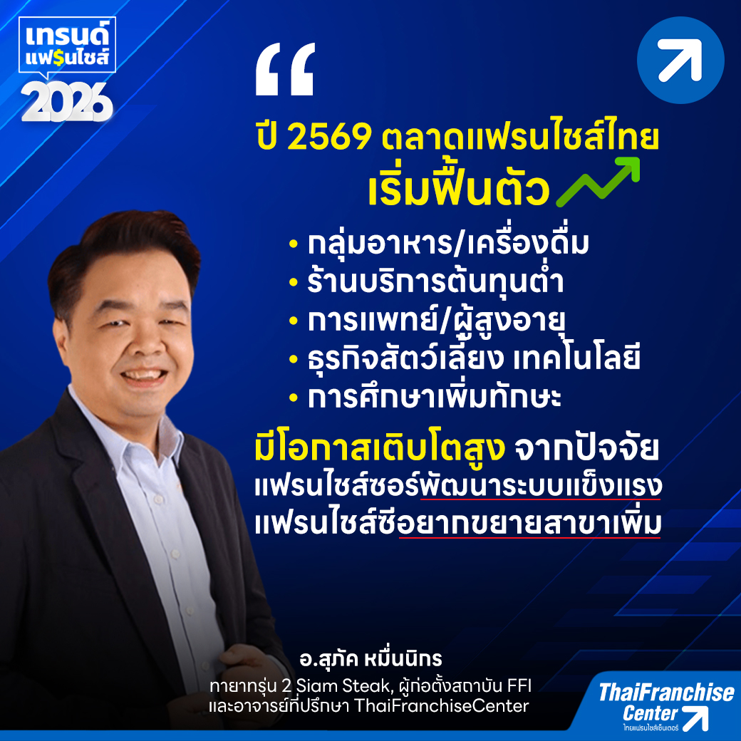 สำหรับแฟรนไชส์ที่มีโอกาสเติบโตในปี 2569 อ.สุภัค ประเมินว่าในปี 2569 ธุรกิจแฟรนไชส์ในประเทศไทยจะเริ่มฟื้นตัวอย่างชัดเจนเมื่อเทียบกับปี 2568 จากปัจจัยสนับสนุน ได้แก่ การปรับปรุงและเสริมความแข็งแกร่งของระบบแฟรนไชส์ซอร์ในช่วงที่ผ่านมา แนวโน้มเศรษฐกิจภายในประเทศดีขึ้น และแฟรนไชส์ซีจำนวนมากเริ่มเห็นผลกำไรจนอยากขยายสาขาเพิ่มเติม