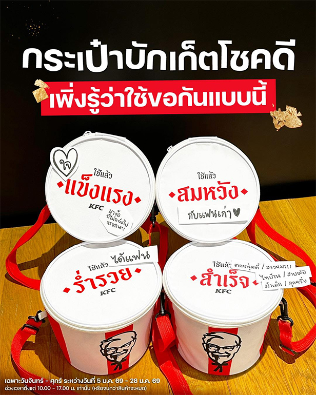 สำหรับแคมเปญ “กระเป๋าบักเก็ตโชคดี” สามารถรับได้เมื่อซื้อชุดบักเก็ตที่ร่วมรายการ ตั้งแต่วันนี้ถึง 28 มกราคม 2569 ที่ร้าน KFC ทุกสาขา (ยกเว้นสาขาสนามบินดอนเมืองและสุวรรณภูมิ)