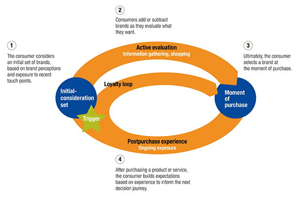 และสมัยก่อนนักการตลาดมักเชื่อในทฤษฎี Marketing Funnel ที่ว่าลูกค้าจะเริ่มจากรู้จักแบรนด์จำนวนมาก (Awareness) แล้วค่อยๆ ตัดตัวเลือกออกจนเหลือที่สนใจ (Consideration) และสุดท้ายก็ซื้อ (Purchase) เหมือนกรวยที่แคบลงเรื่อยๆ แต่เมื่อสังคมเปลี่ยนไปการมีสมาร์ทโฟนเข้ามาในชีวิตประจำวัน McKinsey & Company ได้เสนอแนวคิดใหม่ที่ชื่อว่า The Consumer Decision Journey (CDJ) ซึ่งอธิบายถึงพฤติกรรมผู้บริโภคยุคนี้หมุนวนเป็นวงกลม และมีความซับซ้อนมากขึ้น