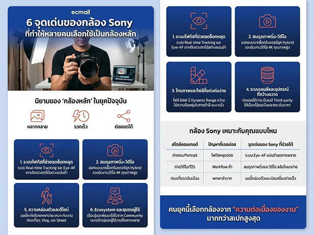 ยุคนี้สเปกตัวท๊อป อาจไม่ชนะใจเท่ากับกล้องที่ช่วยให้ "งานเสร็จไว"  ครีเอเตอร์ส่วนใหญ่หันมาให้ความสำคัญกับ Workflow ตั้งแต่การกดชัตเตอร์ไปจนถึงการส่งไฟล์ที่รวดเร็ว กล้อง Sony จึงตอบโจทย์มากกว่าการเปรียบเทียบแค่จำนวนพิกเซล เพราะช่วยลดความยุ่งยาก และสร้างผลงานได้อย่างต่อเนื่อง
