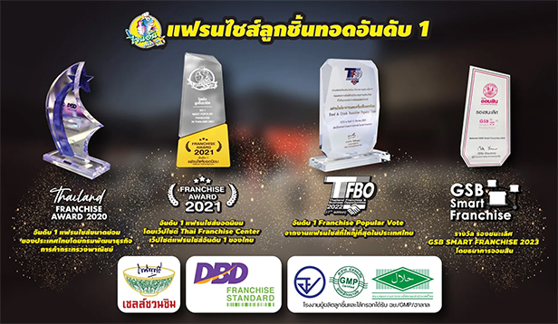 • 2022 ได้รับรางวัล No.1 Franchise Popular Vote จากงาน Thailand Business and Opportunity | งานแฟรนไชส์ที่ใหญ่ที่สุดในประเทศไทย และได้รับรางวัล No.1 Occupation Franchise In Thailand 2022 แฟรนไชส์สร้างอาชีพอันดับ 1 ประจำปี 2022