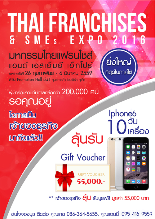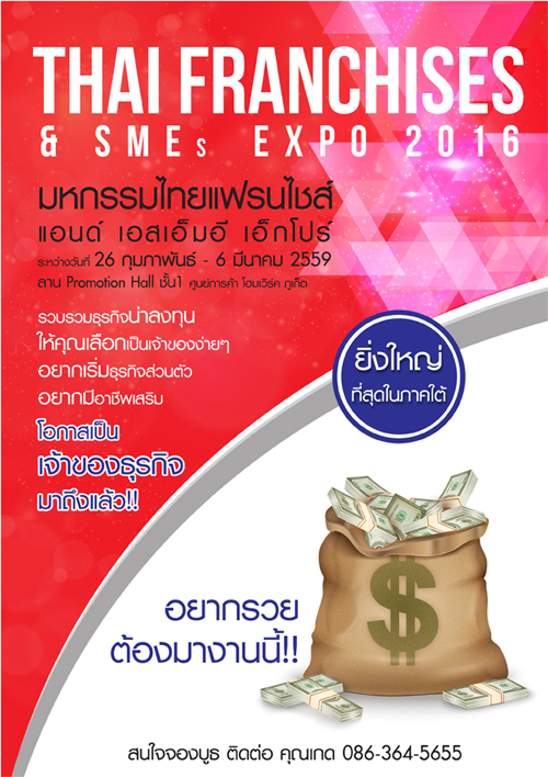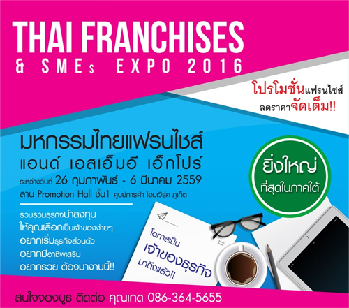 มหกรรม แฟรนไชส์ และ SME ที่ใหญ่ที่สุดในภาคใต้ ระหว่างวันที่ 26 กุมภาพันธ์ ถึง 6 มีนาคม 2559 ที่ลาน Promotion Hall ชั้น 1 ศูนย์การค้า Homeworks ภูเก็ต