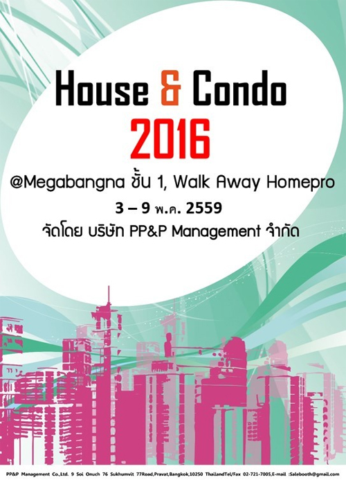 บริษัท พีพีแอนด์พี แมนเนจเม้นท์ จำกัด ผู้ดำเนินการจัดงาน House&Condo 2016@Megabangna ระหว่างวันที่ 3 - 9 พฤษภาคม 2559 ณ ชั้น 1 , Walk Away หน้า Homepro ศูนย์การค้าเมกาบางนา เอาใจคนรักที่อยู่อาศัยที่กำลังมองหาโครงการอสังหาริมทรัพย์ที่มีคุณภาพบนทำเลที่ดีที่สุด ไม่ว่าจะเป็นการซื้อเพื่ออยู่อาศัยหรือการซื้อเพื่อการลงทุน ทุกความต้องการได้ถูกรวบรวมในงานนี้ พร้อมรับข้อเสนอและโปรโมชั่นสุดพิเศษเฉพาะภายในงานนี้เท่านั้น