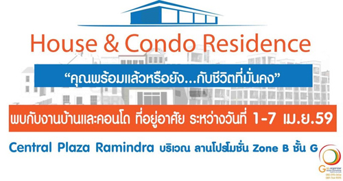งาน House&Condo Residence@CentralPlaza Ramindra ระหว่างวันที่ 1 - 7 เมษายน 2559 งานจัดบริเวณ ลานโปรโมชั่นวงกลม ชั้น G Zone B ตรงกับกลุ่มเป้าหมาย ฐานลูกค้าดีมาก และพบกับโครงการบ้านชั้นนำในการเลือกซื้อที่อยู่อาศัย และกิจกรรมมากมายภายในงาน