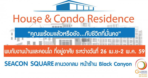 งาน House&Condo Residence@Seacon Square ระหว่างวันที่ 26 เมษายน 2559 - 2 พฤษภาคม 2559 งานจัดบริเวณ ชั้น 1 พื้นที่ลานวงกลม หน้าร้าน Black canyon ตรงกับกลุ่มเป้าหมาย ฐานลูกค้าดีมาก และพบกับโครงการบ้านชั้นนำในการเลือกซื้อที่อยู่อาศัย และกิจกรรมมากมายภายในงาน