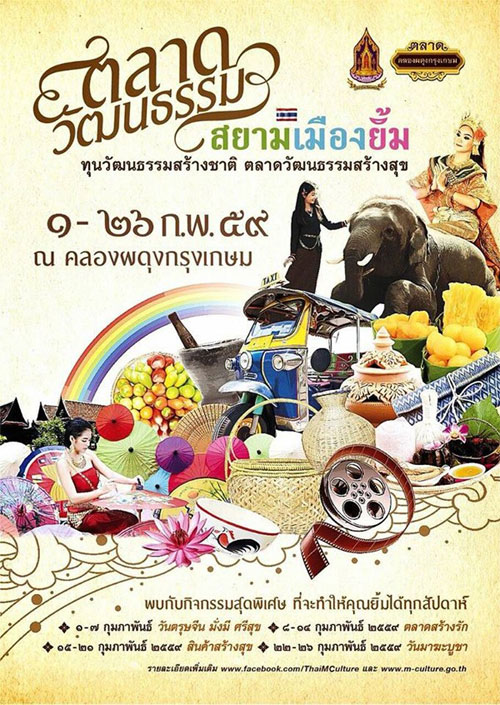 เตรียมพบกับ ตลาดวัฒนธรรม "สยามเมืองยิ้ม ทุนวัฒนธรรมสร้างชาติ ตลาดวัฒนธรรมสร้างสุข" ตั้งแต่วันที่ 1 - 26 กุมภาพันธ์ 2559