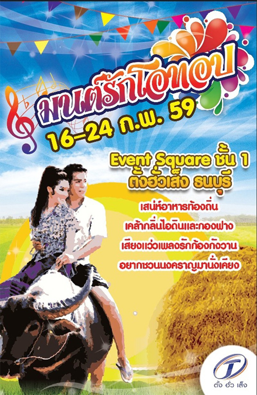มนต์รักโอทอป ลิ้มรสเสน่ห์อาหารท้องถิ่น 4 ภาคและของอร่อยขึ้นชื่อทั่วไทยกับบรรยากาศสไตล์ลูกทุ่ง นั่งพิงกองฟาง สูดกลิ่นไอดิน ทอดสายตามองยอดหญ้า พร้อมฟังตำนานเพลงรักอมตะ หวานซึ้งติดตรึงใจ 16 - 24 ก.พ. 59 ณ Event Square ชั้น 1 ตั้งฮั่วเส็ง ธนบุรี