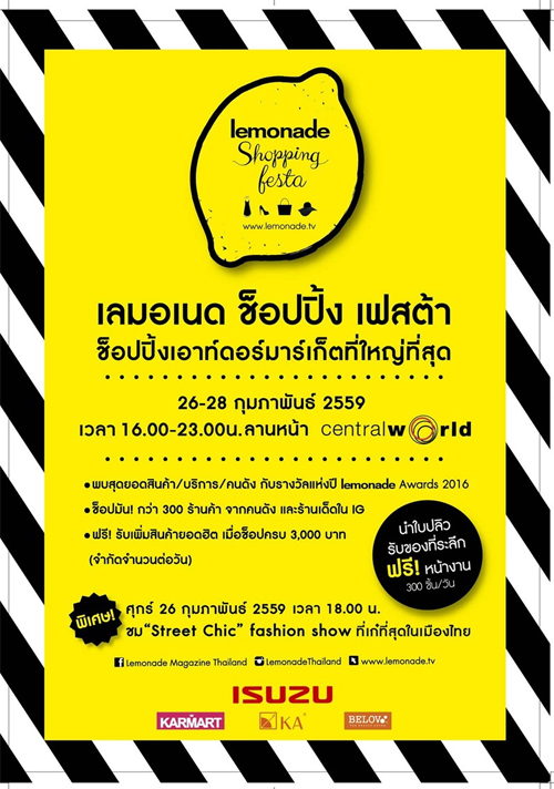 นิตยสาร lemonade (เล-มอ-เนด) จัดงานช็อปปิ้งมาร์เก็ตกลางแจ้งที่ใหญ่ที่สุด งาน “lemonade Shopping Festa” (เลมอเนด ช็อปปิ้ง เฟสต้า) ในวันที่ 26-28 กุมภาพันธ์ 2559 เวลา 16.00-23.00 น. ณ ลานหน้า Central world