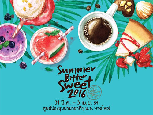 "Coffee Tea & Bakery Fair Songkhla" เสนอ เวอร์ชั่นพักร้อน ตอนพิเศษ เฉพาะกิจ ให้หายคิดถึงกัน ในชื่อตอน …| Summer | Bitter | Sweet | 2016 | 31 มีนาคม-3 เมษายน 2559 ศูนย์ประชุมนานาชาติฉลองสิริราชสมบัติครบ ๖๐ ปี หาดใหญ่ สงขลา Exhibit Profile: กาแฟ ชา เบเกอรี่ ไอศกรีม ขนม ของหวาน เครื่องดื่ม