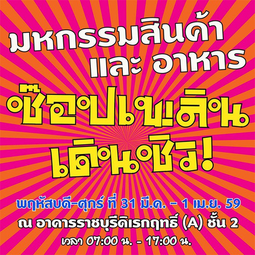 ขอเชิญทุกท่านร่วมช๊อปกับงานมหกรรมสินค้าและอาหาร "ช๊อปเพลินเดินชิว" วันพฤหัสบดี-ศุกร์ ที่ 31 มีนาคม - 1 เมษายน 2559 เวลา 07.00 - 17.00 น. ณ ลานเอนกประสงค์ ชั้น 2 อาคารราชบุรีดิเรกฤทธิ์ (A) ศูนย์ราชการฯ แจ้งวัฒนะ