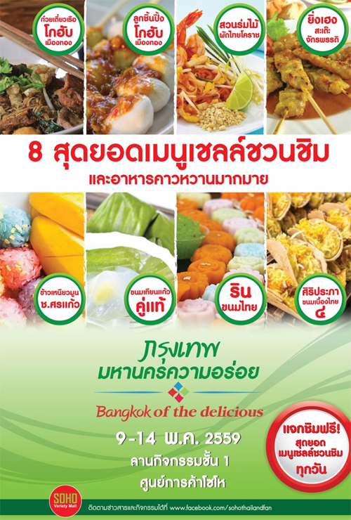 ศูนย์การค้าโซโห (ติด รพ.หัวเฉียว ยศเส) ถนนบำรุงเมือง ชวนลิ้มรสชาติ 8 สุดยอดเมนูเชลล์ชวนชิม และเลิศรสกับอาหารคาวหวานมากมายในงาน “กรุงเทพ...มหานครความอร่อย” ระหว่างวันที่ 9 - 14 พ.ค. 59 บริเวณลานกิจกรรมชั้น 1 ศูนย์การค้าโซโห พร้อมแจกชิมฟรี!!! สุดยอดเมนูเชลล์ชวนชิมทุกวัน ถวายเป็นพระราชกุศลแด่พระบาทสมเด็จพระเจ้าอยู่หัว ในวโรกาสมหามงคลปีพระราชสมภพ 88 พรรษา