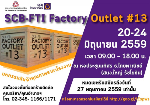 กลับมาอีกครั้ง!!! มหกรรมแสดงสินค้าคุณภาพ ราคาโรงงาน SCB-FTI Factory Outlet ครั้งที่ 13 วันที่ 20-24 มิถุนายน 2559 เวลา 09.00 – 18.00 น. ณ หอประชุมมหิศร ธ.ไทยพาณิชย์ (สนง.ใหญ่ รัชโยธิน) งานนี้เป็นการพบปะระหว่างผู้ผลิตและผู้ซื้อโดยตรงซึ่งจะมีผู้เข้าร่วมชมงานกว่า 10,000 คน /วัน และจำนวนคูหามากกว่า 200 คูหา