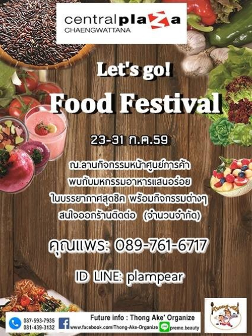 มหกรรมอาหารแสนอร่อยในงาน Let's Go Food Festival ณ ศูนย์การค้าเซ็นทรัลพลาซ่า แจ้งวัฒนะ วันที่ 23-31 กรกฏาคม 2559 พบกับสินค้าแสนอร่อยในบรรยากาศสุดชิค พร้อมกิจกรรมต่าง ๆ มากมาย