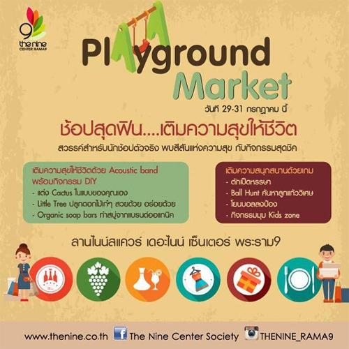 พีเรียดสุดพิเศษ!! เพียงแค่3วันเท่านั้น วันที่ 29-31 กรกฎาคม 2559 (ศ-อา) กับงาน "PLAYGROUND MARKET" เปลี่ยนที่ check-in แล้วชวนมาชอปแบบฟินทั้งครอบครัว กิจกรรมจัดเต็มตลอดงาน ทั้งWorkshopสุดชิค, ร่วมเล่นเกมส์รับของรางวัลพร้อม MCและกิจกรรมบนเวที (วงอคูสติคแบนด์) ห้ามพลาดความสนุกนี้ ที่ เดอะไนท์ เซ็นเตอร์ พระราม9