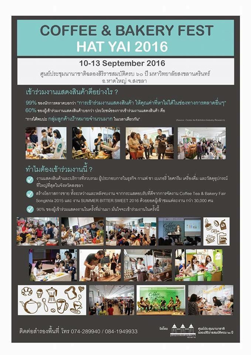 ขอเชิญร่วมงาน Coffee & Bakery Fest งานแสดงสินค้าและบริการที่รวบรวม ผู้ประกอบการในธุรกิจ กาแฟ ชา เบเกอรี่ ไอศกรีม เครื่องดื่ม และ วัสดุอุปกรณ์ ที่ใหญ่ที่สุดในจังหวัดสงขลา