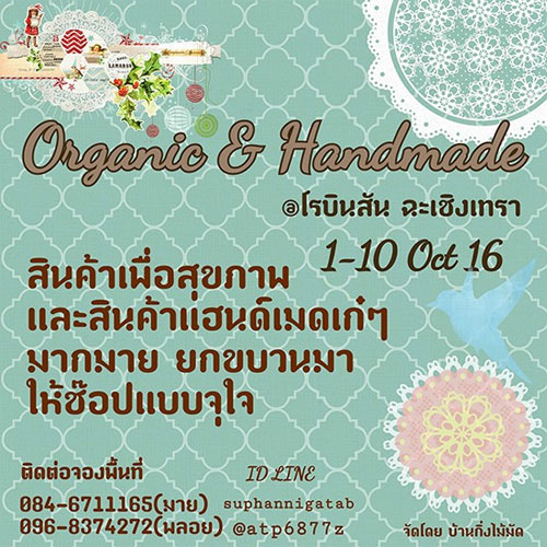 ขอเชิญมาร่วมช้อป ชิม ชิว กันได้ที่งาน Organic & Handmade พบกับสินค้าเพื่อสุขภาพและสินค้าแฮนด์เมดเก๋ๆมากมาย ยกขบวนมาให้เลือกช๊อปแบบจุใจ อยากใช้ชีวิตให้ป๊อปต้องมาช๊อปที่นี่ ต้องห้ามพลาดแล้ว!! ในวันที่ 1-10 ตุลาคม 2559 ณ โรบินสัน ฉะเชิงเทรา