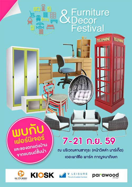 Furniture & Decor Festival พบกับเฟอร์นิเจอร์และของตกแต่งบ้านชั้นนำ 7-21 กันยายน 59 ณ บริเวณซากุระ (หน้าวิลล่า มาร์เก็ต) The Paseo Park กาญจนาภิเษก