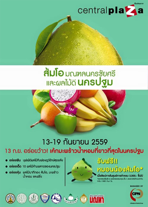 มีของดีหลายอย่างที่พลาดไม่ได้ในงาน "ส้มโอมณฑลนครชัยศรีและผลไม้ดีนครปฐม" ตั้งแต่วันที่ 13-19 กันยายนนี้ ที่ศูนย์การค้าเซ็นทรัพลาซา ศาลายา 13 ก.ย. เวลา 16.00 น.มาร่วมบันทึกประวัติศาสตร์กับเค้กมะพร้าวน้ำหอมที่ยาวที่สุดในจังหวัดนครปฐม พร้อมรับฟรี!! เค้กมะพร้าว น้ำหอมอร่อยๆ ท่านละ 1 ชิ้น (มีจำนวนจำกัด)
