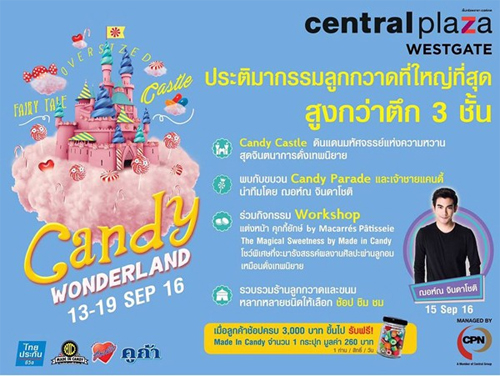 Candy Wonderland เนรมิตลานกว้าง ศูนย์การค้า CentralPlaza WestGate ให้กลายเป็น“ดินแดนมหัศจรรย์แห่งความหวาน สุดจินตนาการดั่งเทพนิยาย”กับ Hi-light สุดอลังการ Candy Castle ประติมากรรมลูกกวาดที่ใหญ่ที่สุด สูงกว่าตึก 3 ชั้น ตื่นตาตื่นใจไปกับ Candy Land ลูกกวาดหลากชนิดหรรษาพาเหรดลูกกวาดและเกมแจกรางวัลมากมายที่จะทำให้คุณประทับใจไม่รู้ลืม