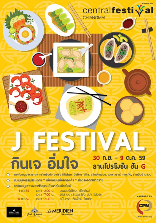 ศูนย์การค้าเซ็นทรัลเฟสติวัล เชียงใหม่ จัดงาน J Festival 2016 กินเจ อิ่มใจ ชวนผู้ถือศีลกินเจและคนรักสุขภาพร่วมอิ่มบุญพร้อมรับความสุขใจ ด้วยเมนูอาหารเจคุณภาพเยี่ยมจากร้านอาหารชื่อดัง อาทิ กาแฟเจจาก Coffee Villa , สลัดเจ จากร้านสลัดบ้านสวน และเมนูเจสุขภาพกว่า 100 เมนู พร้อมชิมเมนูเจ เสริมสิริมงคล “เผือกหิมะและเผือกทองคำ” ส่งตรงจากเยาวราช