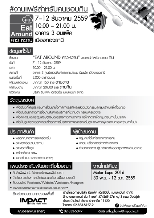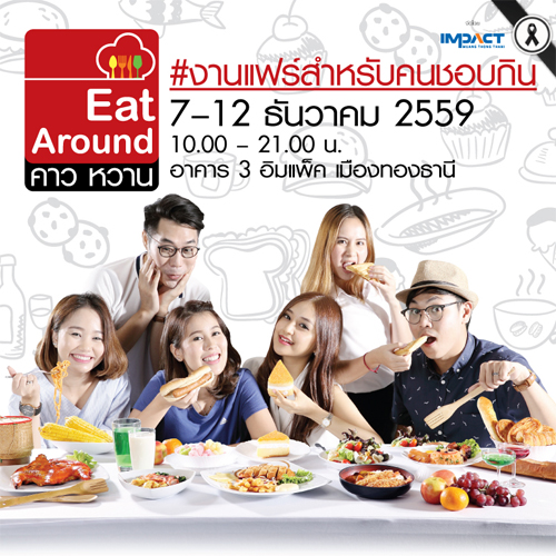 บริษัท อิมแพ็ค เอ็กซิบิชั่น แมเนจเม้นท์ จำกัด จัดงาน “ EAT AROUND คาวหวาน ” งานแฟร์ที่คนชอบกินต้องมา ยกทัพของกินมากกว่า 150 ร้านค้า รวมร้านเด็ดเมนูดังจากทั่วสารทิศ มาให้เลือกช้อป ชิม ภายใต้บรรยากาศไทยๆเคล้ากลิ่นอายของทั้งสี่ภาค อาทิเช่น อาหารพร้อมรับประทาน, เครื่องดื่ม, ชา, กาแฟ, เบเกอรี่, ขนม, ของหวาน และของฝากนานาชนิด