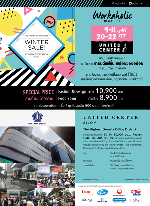 Workaholic Market WINTER SALE :: ช้อป ชิม ชิลล์ รับลมหนาวต้นปี ใจกลางย่านออฟฟิศสีลม จัดเต็ม! ครบทั้งสินค้าแฟชั่น งานดีไซน์ไม่ซ้ำใคร และของกินอร่อยเวอร์ เข้าถึงกลุ่มพนักงานออฟฟิศและผู้บริหารที่มีเวลาน้อย และติดอยู่กับชีวิตเร่งรีบ "แบบถึงที่"