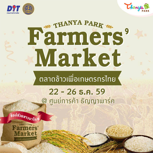 ชวนคุณมาช้อป แถมได้ช่วยชาวนา กิจกรรมดีๆที่ศูนย์การค้า ธัญญาพาร์ค ร่วมกับ กรมการค้าภายใน กระทรวงพาณิชย์ จัดงาน Thanya Park Farmers' Market ตลาดข้าวเพื่อเกษตรกรไทย พบกับตลาดข้าวจากพี่น้องเกษตรกร ชาวนาไทย คัดคุณภาพส่งตรงถึงมือคุณ ตั้งแต่วันที่ 22-26 ธ.ค. 59 นี้ ช้อปข้าวแถมได้ช่วยชาวนา งานดีๆแบบนี้ที่เราไม่อยากให้คุณพลาด แล้วพบกันนะคะ