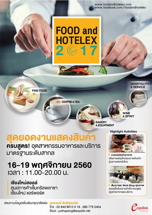 บริษัท เอ็กซ์โปลิงค์ โกลบอล เน็ทเวอร์ค จำกัด ได้ดำเนินการจัดงานแสดงสินค้าอุตสาหกรรมอาหารและบริการ FOOD and HOTELEX 2017 ซึ่งจะจัดขึ้นในวันที่ 16-19 พฤศจิกายน 2560 ณ เชียงใหม่ฮอลล์ เซ็นทรัลพลาซา เชียงใหม่ แอร์พอร์ต ทางบริษัทฯ จึงใคร่ขอเรียนเชิญทุกท่านที่สนใจเข้าร่วมเป็นส่วนหนึ่งในงานแสดงสินค้าในครั้งนี้