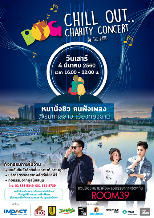 อิมแพ็คฯ จัดงาน "DOG CHILL OUT.. CHARITY CONCERT BY THE LAKE” เชิญคนรักสัตว์เลี้ยง จูงน้องหมาน้องแมวมานั่งชิลริมทะเลสาบยามเย็น เพลิดเพลินกับเสียงเพลงเพราะๆ จากศิลปินสุดฮอต "Room 39" พร้อมช้อปสินค้า และฟรีกิจกรรมตรวจสุขภาพสำหรับสัตว์เลี้ยง