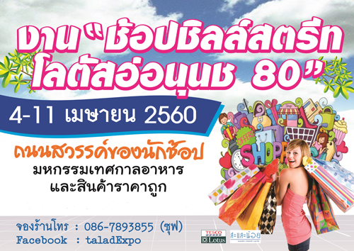 ขอเชิญเที่ยวงาน “ช้อปชิลล์สตรีท โลตัสอ่อนนุช 80” ถนนสวรรค์ของนักช้อป พบกับมหกรรมงานแฟร์แสดงสินค้าราคาถูก อาหารอร่อย สินค้าจากโรงงานผู้ผลิต หรรษาไปกับสวนสนุก เพลิดเพลินกับนักร้องนักแสดง และตลกมากมายหลายคณะ และกิจกรรมอื่น ๆ อีกมากมายภายในงาน