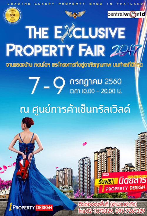 The Exclusive Property Fair 2017 @ Central Worldสุดยอดงานแสดงบ้าน คอนโด และโครงการที่อยู่อาศัยคุณภาพเหนือระดับ บนทำเลที่ดีที่สุดระหว่างวันที่ 7 - 9 กรกฎาคม 2560 (ศุกร์ - อาทิตย์)เวลา10.00 - 20.00 น.สถานที่จัดงาน ศูนย์การค้าเซ็นทรัลเวิลด์ บริเวณ Atrium 2 ชั้น 1
