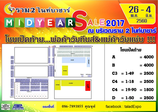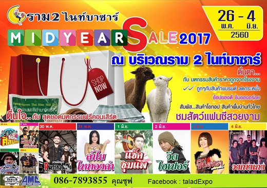 มหกรรมงานแฟร์ครั้งยิ่งใหญ่ MIDYEAR SALE 2017 ณ.ราม 2 ไนท์บาซาร์ ติดหอพักและตลาดนัมเบอร์วัน วันที่ 26 พ.ค. - 4 มิ.ย. 60 นี้ พบกับ สินค้าแบรนด์เนม อาหารหลากรส ของใช้ เสื้อผ้า โซนตลาดนัดก็มา และโซนต้นไม้ ดอกไม้มากมายภายในงาน