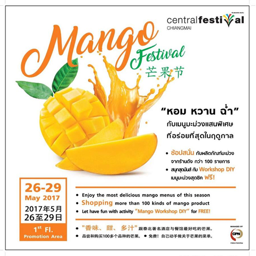 ศูนย์การค้าเซ็นทรัลเฟสติวัล เชียงใหม่ ชวนเที่ยวเทศกาลมะม่วงที่คุณรอคอย รวมมะม่วงพันธุ์ดีที่สุดแห่งปี “หอม หวาน ฉ่ำ” กับเมนูมะม่วงแสนพิเศษที่อร่อยที่สุดในฤดูกาล , ช้อปสนั่นกับผลิตภัณฑ์จากร้านดังกว่า 100 รายการ พร้อมสนุกกับ workshop DIY เมนูมะม่วงสุดชิค ร่วมลิ้มรสชาติแห่งความอร่อยที่สุดแห่งปีกับมะม่วงหลากหลายสายพันธุ์จากเกษตรกรท้องถิ่น