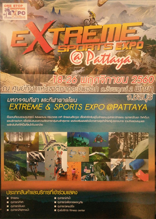 Extreme Sports & Expo@Pattaya 18-26 พฤศจิกายน 2560 ณ ศูนย์กีฬาภาคตะวันออกพัทยาพบกับมหกรรมกีฬา และกีฬาผาดโผน ซึ่งเป็นงานที่รวบรวมอุปกรณ์ Adventure ครบวงจร เสื้อผ้าสำหรับนักปั่น อุปกรณ์จักรยาน ชุดกีฬา และอื่นๆ ประเภทสินค้าที่เข้าร่วม จักรยาน อุปกรณ์กีฬา อุปกรณ์ปีนเขา อุปกรณ์กีฬาทางน้ำ อุปกรณ์ดำน้ำ อุปกรณ์เพื่อการผจญภัย อุปกรณ์แคมป์ปิ้ง ศูนย์บริการ ฟิสเนต เซ็นเตอร์ อื่นๆ