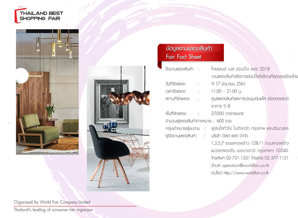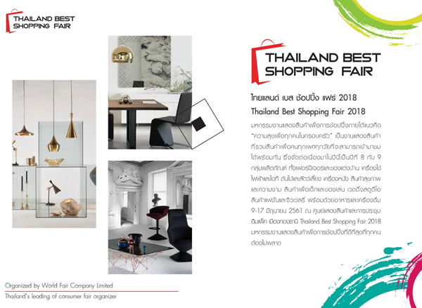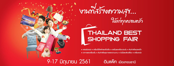 Thailand Best Shopping Fair 2018 งานที่รวบรวมสินค้ามากมายไว้ในงานเดียวที่ได้รับการตอบรับจากผู้ชมงานเป็นจำนวนมากตลอด 8 ปีเต็ม กับผู้จัดงานแสดงสินค้ามือออาชีพมาด้วยประสบการณ์กว่า 35 ปี จะกลับมาสร้างงประสบการณ์ช๊อปปิ้งให้แก่ผู้บริโภคอีกครั้งหนึ่ง พร้อมกับองค์ประกอบของไลฟ์สไตล์คนเมืองกับ 9 กลุ่มสินค้าเพื่อผู้บริโภค
