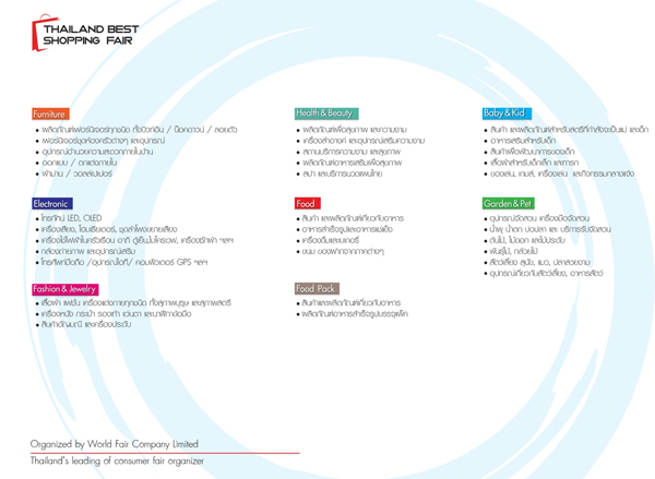 ประเภทสินค้า : สำหรับผู้ประกอบการสินค้าต่างๆ ทางเราได้มีการเปิดจองพื้นที่ให้ผู้ประกอบการได้ร่วมงานในครั้งนี้ โดยจะแบ่งประเภทสินค้าออกเป็นประเภทดังต่อไปนี้