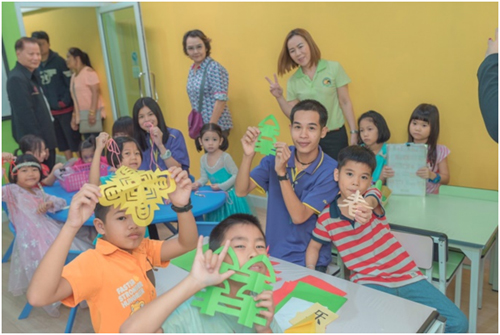 รวมถึงการเรียนภาษาจีนที่ใช้พื้นฐานของหลักสูตรที่มีมานานกว่าสองพันปีมาประยุกต์ให้เข้ากับยุคสมัยเป็นการสอนผ่านสื่อต่างๆ เช่นวีดีทัศน์ บัตรคำ และการเล่านิทาน ฯลฯทำให้นักเรียนจดจำคำศัพท์ภาษาจีนและรูปประโยคต่างๆ และสามารถนำไปใช้กับสถานการณ์จริงในชีวิตประจำวันได้