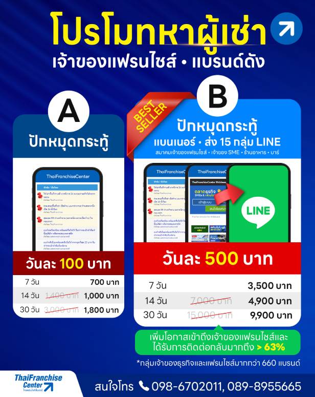 มีทำเลดี! ทำยังไงถึงจะมีคนเช่า? มีธุรกิจของตัวเองจะหาที่เช่าทำเลดีได้จากที่ไหน? เมื่อความต้องการที่มีเป้าหมายเดียวกันทำอย่างไรให้ทั้ง 2 ฝ่ายได้มีโอกาสพบกัน ThaiFranchiseCenter ในฐานะเป็นเว็บไซต์ที่รวบรวมธุรกิจแฟรนไชส์ที่ใหญ่ที่สุดในไทย เปิดบริการใหม่ โอกาสทอง! เสนอพื้นที่เช่าให้เจ้าของ SMEs และแฟรนไชส์ มากกว่า 660 แบรนด์