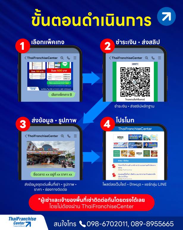 - ผู้เช่าและเจ้าของพื้นที่เช่าสามารถติดต่อกันได้โดยตรง ไม่ต้องผ่าน ThaiFranchiseCenter