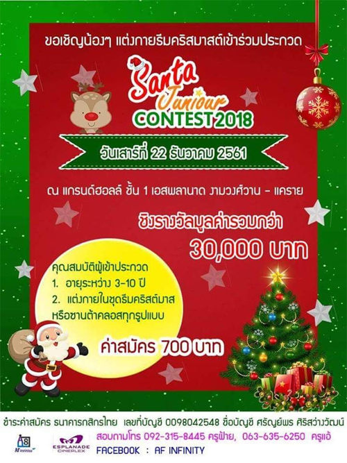 ขอเชิญน้องๆ แต่งกายธีมคริสมาสต์เข้าร่วมประกวด "Santa Junior contest 2018" วันเสาร์ที่ 22 ธันวาคม 2561 ชิงเงินรางวัลรวมกว่า 30,000 บาท
