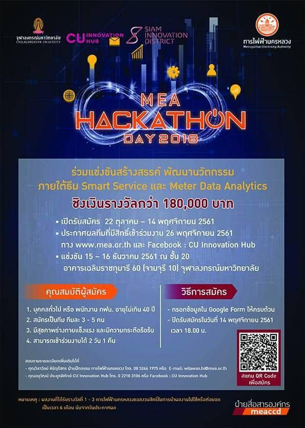 การไฟฟ้านครหลวง (กฟน.) ร่วมกับ CU Innovation Hub ขอเชิญชวนผู้สนใจ บุคคลทั่วไป ที่มีอายุไม่เกิน 40 ปี ที่มีความสนใจทางด้านนวัตกรรม เพื่อร่วมเป็นส่วนหนึ่งของ MEA Hackathon Day 2018 ชวนมาปล่อยพลัง สร้างนวัตกรรม ภายใต้ธีม Smart Service และ Meter Data Analytics ชิงเงินรางวัลกว่า 180,000 บาท เปิดรับสมัครต้งแต่บัดนี้ - 14 พ.ย. 61