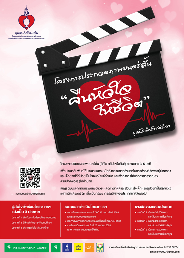 มูลนิธิเด็กโรคหัวใจ ในพระอุปถัมภ์ของ สมเด็จพระเจ้าพี่นางเธอ เจ้าฟ้ากัลยาณิวัฒนา กรมหลวงนราธิวาสราชนครินทร์ ขอเชิญชวนผู้สนใจร่วมส่งผลงานเข้าประกวดภาพยนตร์สั้น “คืนหัวใจ - ให้ชีวิต” ชิงเงินรางวัลรวมกว่า 60,000 บาท