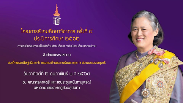 สาขาวิชาสังคมศึกษา คณะครุศาสตร์ มหาวิทยาลัยราชภัฏสวนสุนันทา ขอเชิญนักเรียนระดับชั้นมัธยมศึกษาตอนปลาย สมัครเข้าร่วมการแข่งขันความเป็นเลิศทางด้านสังคมศึกษา โครงการสังคมศึกษาวิชาการ ครั้งที่ 4 ประจำปีการศึกษา 2562 ชิงถ้วยรางวัลพระราชทาน สมเด็จพระกนิษฐาธิราชเจ้า กรมสมเด็จพระเทพรัตนราชสุดาฯ สยามบรมราชกุมารี พร้อมทุนการศึกษา