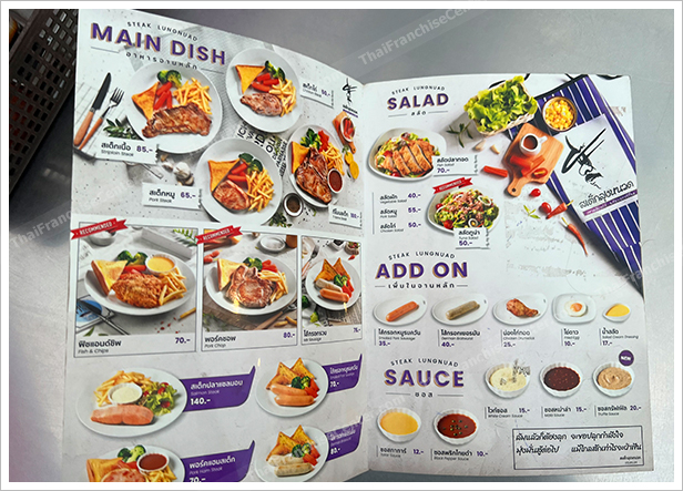เมนูยอดนิยม เช่น สเต็กหมูพอร์คชอพ, หมูพริกไทยดำ, สันคอหมู, สะโพกไก่สไปซี่, สเต็กเนื้อทีโบน, ปลาดอรี่ทอด, ไส้กรอกและเครื่องเคียงอื่นๆ เงื่อนไขการลงทุน, เงินลงทุนเริ่มต้นเพียง 9,900 - 17,900 บาท