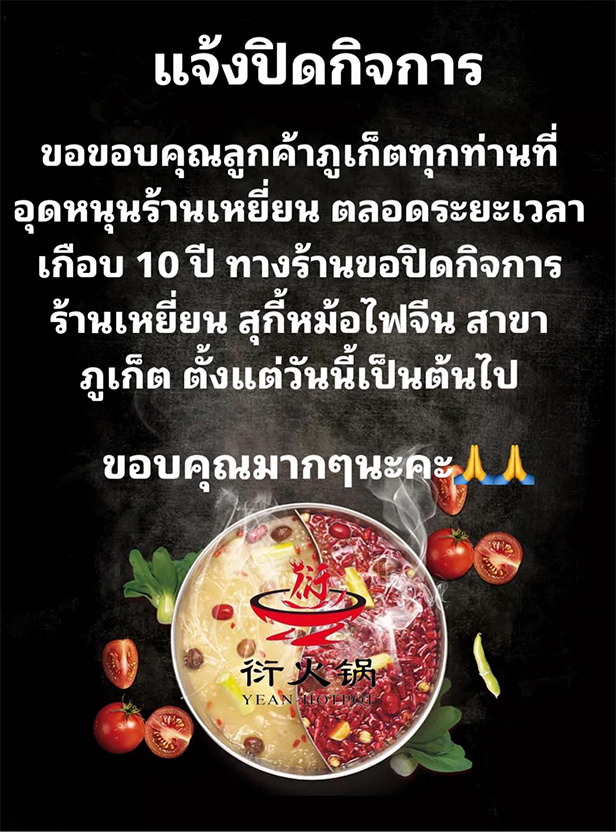 ร้านสุกี้หม้อไฟจีน “เหยี่ยน衍” ที่เปิดให้บริการในจังหวัดภูเก็ตมากว่า 10 ปี ประกาศปิดกิจการอย่างเป็นทางการตั้งแต่วันที่ 26 สิงหาคม 2568 โดยร้านได้ขอบคุณลูกค้าที่สนับสนุนมาโดยตลอดทศวรรษที่ผ่านมา
