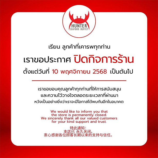 ร้านบุฟเฟต์ซีฟู้ด “Hunter Seafood Buffet” ประกาศปิดให้บริการตั้งแต่วันที่ 10 พฤศจิกายน 2568 พร้อมกล่าวขอบคุณลูกค้าที่สนับสนุนตลอดระยะเวลาที่เปิดทำการ โดยระบุว่า “ทุกเสียงหัวเราะและรอยยิ้มของลูกค้าจะอยู่ในใจทีมงานเสมอ”